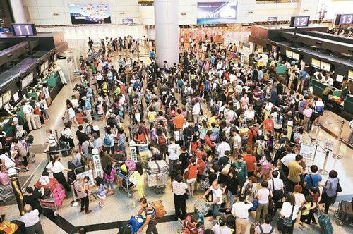 桃园机场公司统计,9日凌晨5时起,每小时的入出境旅客超过3000人,然后攀升到每小时6000至7000人,一直持续到深夜12时。桃园机场目前只有单跑道运作,每小时最高容量只有33架次,航厦旅客拥挤,天空及地面航机也挤成一团。