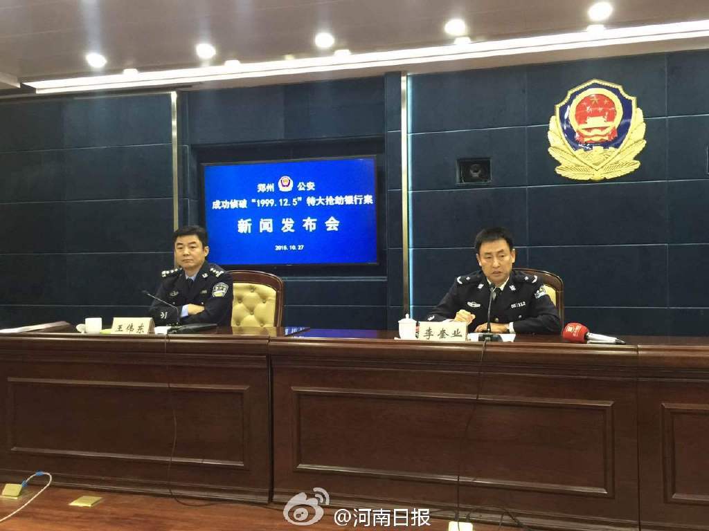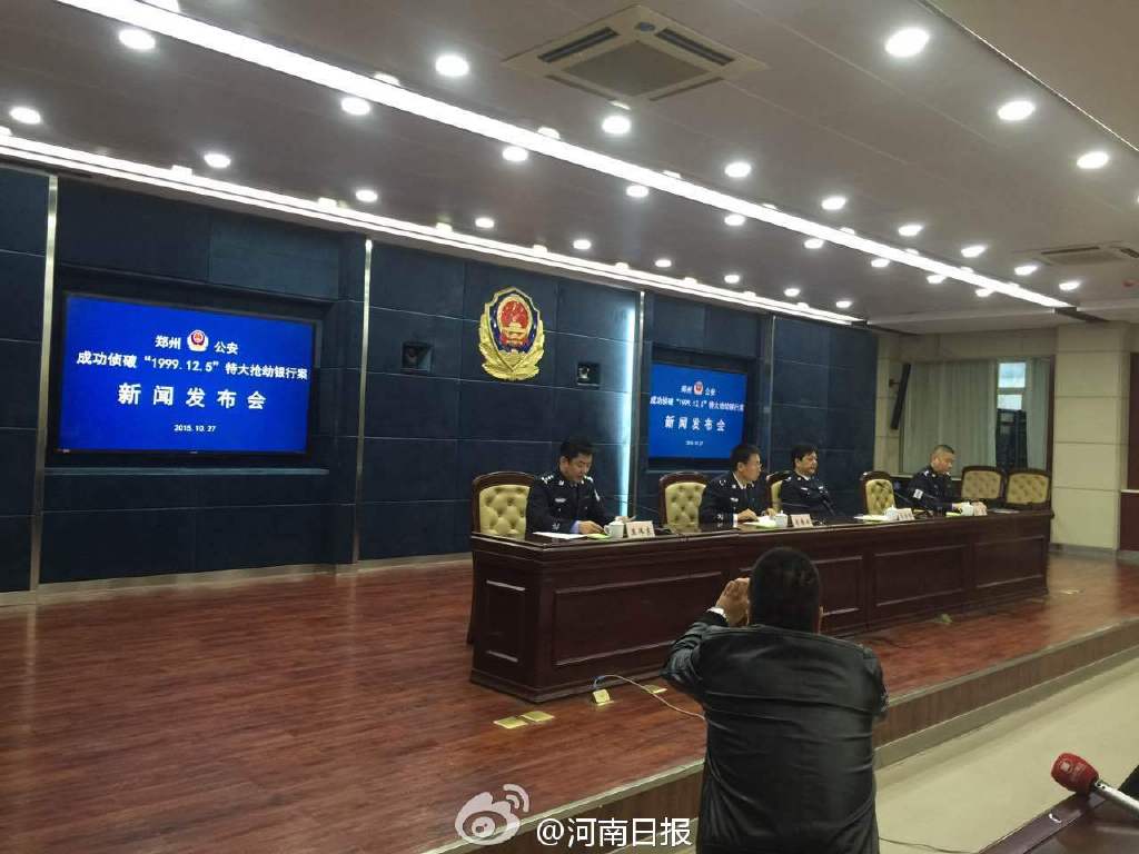 今天上午,郑州警方召开“1999.12.5”特大持枪抢劫银行案新闻发布会。1999年12月5日,5名犯罪嫌疑人持枪闯进郑州一银行,打伤保安和银行职员并抢走208万现金后潜逃。今年10月,郑州警方在驻马店将5名犯罪嫌疑人抓获归案。