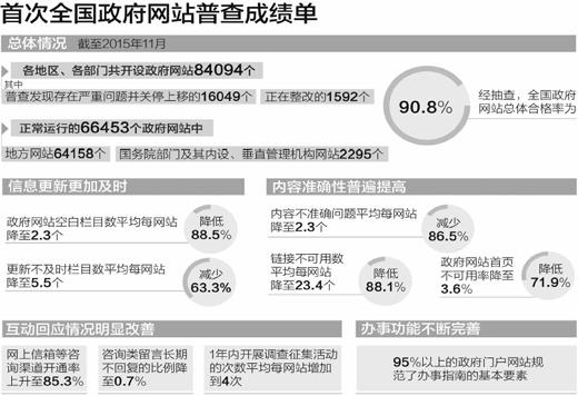 经过这次普查整顿,政府网站“四不”现象得到系统性解决。数据显示,政府网站更新不及时栏目数每家网站平均减少逾六成,咨询类留言长期不回复比例大幅下降,95%以上的政府门户网站规范了办事指南的基本要素,提高了网上服务实用性。