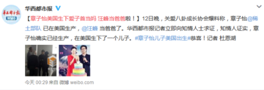 @华西都市报【章子怡美国生下爱子首当妈 汪峰当爸爸啦!】12日晚,关爱八卦成长协会爆料称,章子怡@稀土部队已在美国生产,@汪峰当爸爸了。华西都市报记者立即向知情人士求证,知情人证实,章子怡确实已经生产,在美国生下了一个儿子。#章子怡儿子美国出生#恭喜!