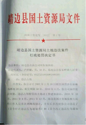 记者调查发现,仅2011年,靖边县国土资源局监察大队就下达了十余次《责令停止违法行为通知书》和《责令改正违法行为通知书》。