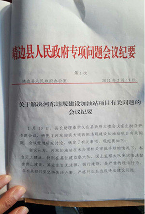 2012年2月13日,靖边县人民政府《关于解决河东违规建设加油站项目有关问题的会议纪要》显示,专项会议认为:“河东加油站在未办理相关审批手续的情况下,私自开工建设,特别在县住建监察大队、国土监察大队多次依法督查停止建设,其业主目无法律,强行建设,是严重的违法行为。”要求县政府办公室督办,如期落实“业主限期拆除”,河东加油站属违章建筑,各相关部门不得验收。县商务局、工商局、地税局等部门和单位不得办理任何经营手续。