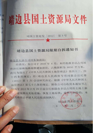 2012年2月22日,靖边县国土资源局再次下发《靖边县国土资源局限期自拆通知书》:“经查实,靖边县石油公司河东加油站于2010年4月,未经批准非法占用国营沙石峁林场林地修建加油站,占地面积6050平方米,逾期不拆除的,本机关将依法申请人民法院强制执行。”