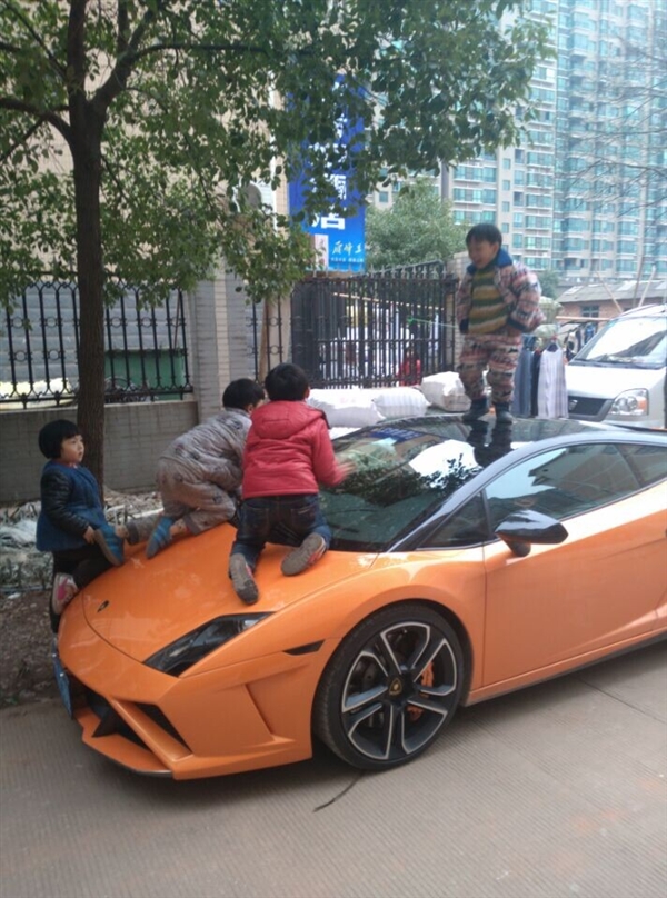 图为2014 年在网上流传的兰博基尼被虐照。这辆兰博基尼停在路边,一个“熊孩子”站在车顶,引擎盖上也趴着两个。这是一辆 2011 款的 Gallardo,车已停产,售价在400万左右。