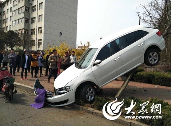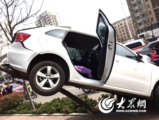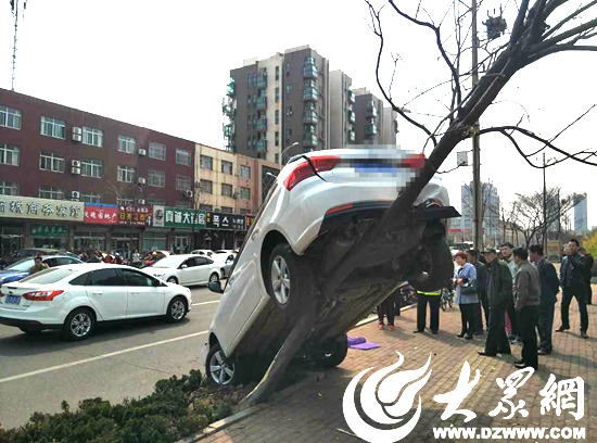 11日下午1时30分左右,在日照天津路凤凰小学西侧发生一起“轿车爬树”的交通事故,一辆白色的大众轿车车主错将油门当刹车,在倒车时,“爬”上了道路一侧的树上,引起了周围市民的围观。 (大众网摄友团 宋年升摄)