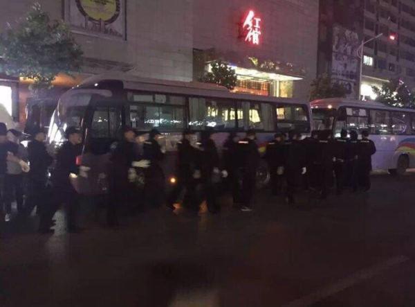 网友向澎湃新闻提供了两段视频。其中的一段显示,大量执法人员冲进红馆灯火通明的大堂,警方大巴缓缓停在门口路上。在另一段视频中,在深夜警笛声中,涉黄场所红馆缤纷年代KTV的灯箱招牌闪亮,该场所门前停着一长排大巴,有大巴车身涂有“警察”字样,红馆门前已被拉起警戒线,警戒线内聚集数名警员。 (来自:澎湃新闻)
