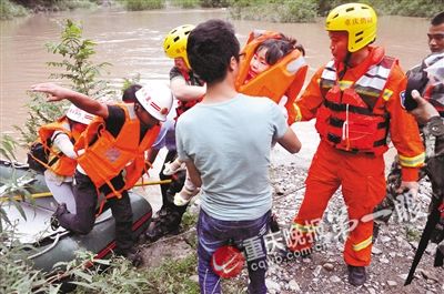接到报警后,丰都消防大队迅速出动一辆抢险救援消防车和7名官兵赶往现场。18时10分,救援官兵抵达现场。经过仔细勘察河道,救援官兵发现此时河水保持在6米左右的深度,涉水救援根本不可能。河道两旁没有合适的支点,想通过绳索横渡救援也不行。好在此时水流虽急,但还在舟艇行驶的承受范围内,现场指挥员立即要求大队指挥中心调集1艘橡皮艇到场。