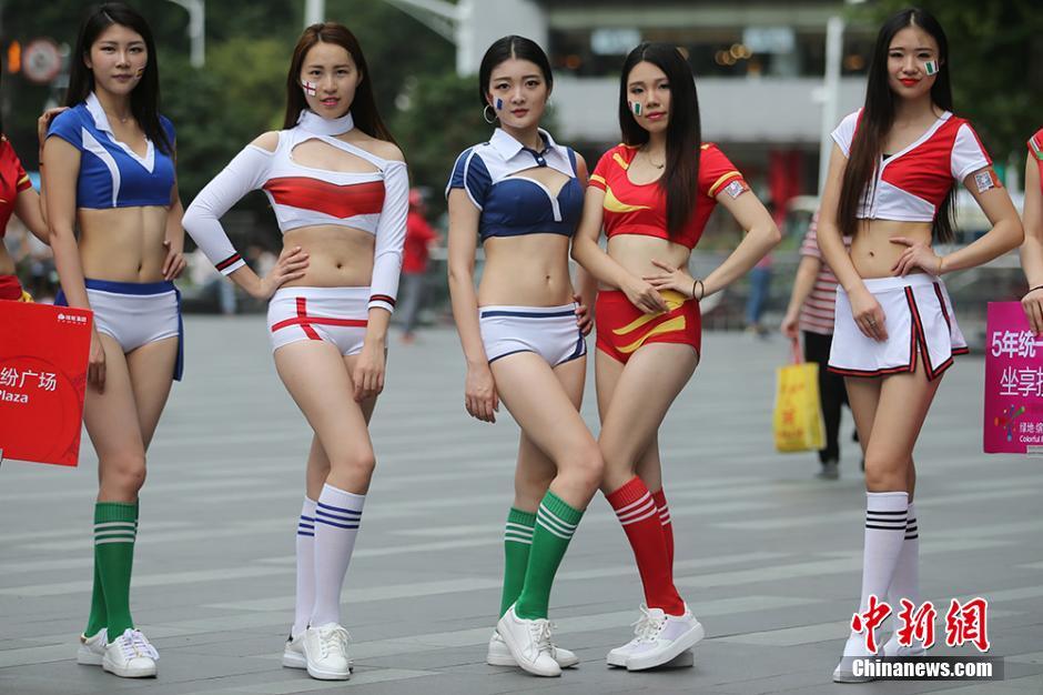 6月19日,身着以欧洲杯参赛球队球衣为元素服装的“足球宝贝”亮相南京街头,性感装扮引人关注。 泱波 摄