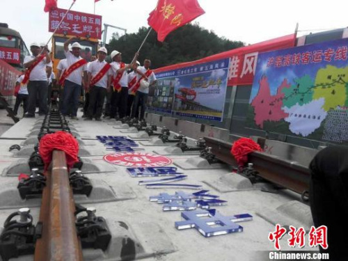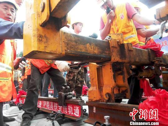 16日下午,沪昆高铁贵州西段全线完成铺轨施工,沪昆高铁西段全线贯通。 郑珍荣 摄