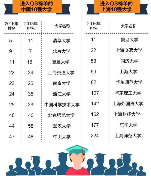 【新民晚报·新民网】北京时间今天凌晨,全球高等教育分析机构QS全球教育集团发布了2016年版《QS亚洲大学排名》。在这次最新排名中,新加坡国立大学、香港大学、南洋理工大学、香港科技大学排名亚洲前4。清华大学成为中国排名最高的学府,在亚洲20强大学中进步最大,一年提升6名,上升至亚洲区第5名,超过了排名第9的北京大学。复旦大学也出现明显进步,在去年的基础上上升5位,排名亚洲第11位。