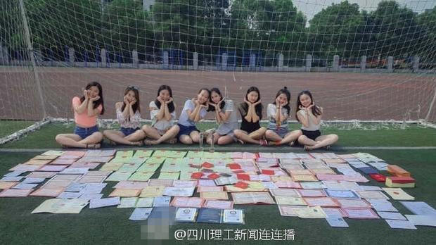 日前,认证微博网友“四川理工新闻连连播”发布微博称,该校生物工程学院酿酒工程专业的8名女生在操场展示了大学四年来的百余张证书并拍照留影。