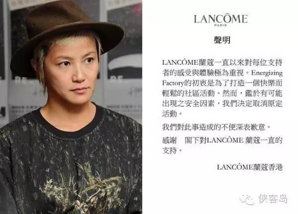 何韵诗之前获邀参加兰蔻的一场音乐会,引发内地网友抗议抵制后,兰蔻一日之类两次发表声明,表示何韵诗并非其品牌代言人,试图与何韵诗划清界限。之后又以安全为由,取消了原本与何韵诗合作的演唱会。