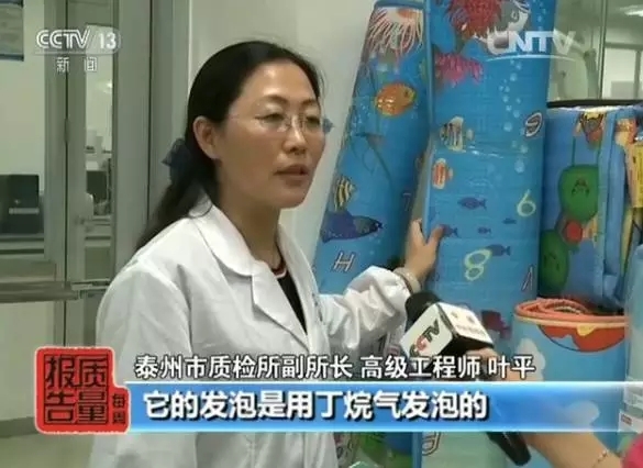 泰州市质检所副所长叶平说,整体式地垫的发泡工序与拼接式地垫不同。整体式地垫是用丁烷气发泡,不会含有甲酰胺。拼接式地垫用偶氮二甲酰胺发泡,而且加得越多,发泡效果越好,地垫质量越轻。偶氮二甲酰胺在高温分解重组的时候,就会有甲酰胺残留在里面。而目前,国家没有对地垫中甲酰胺的含量作出标准规定。因此企业为了降低成本,就会大量使用偶氮二甲酰胺。