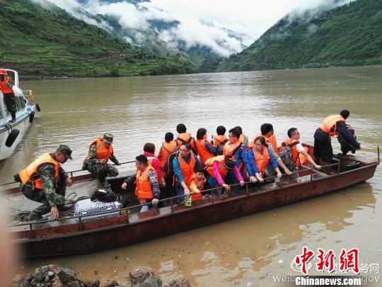 图为丽宁公路部分路段发生塌方,救援人员利用水上交通工具转移被困民众。 丽江市委宣传部官方微博 摄