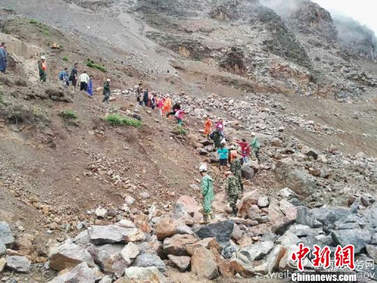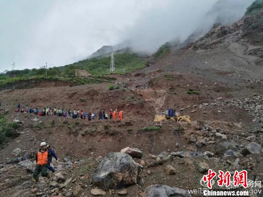 图为丽宁公路部分路段发生塌方,救援人员转移被困民众。 丽江市委宣传部官方微博 摄