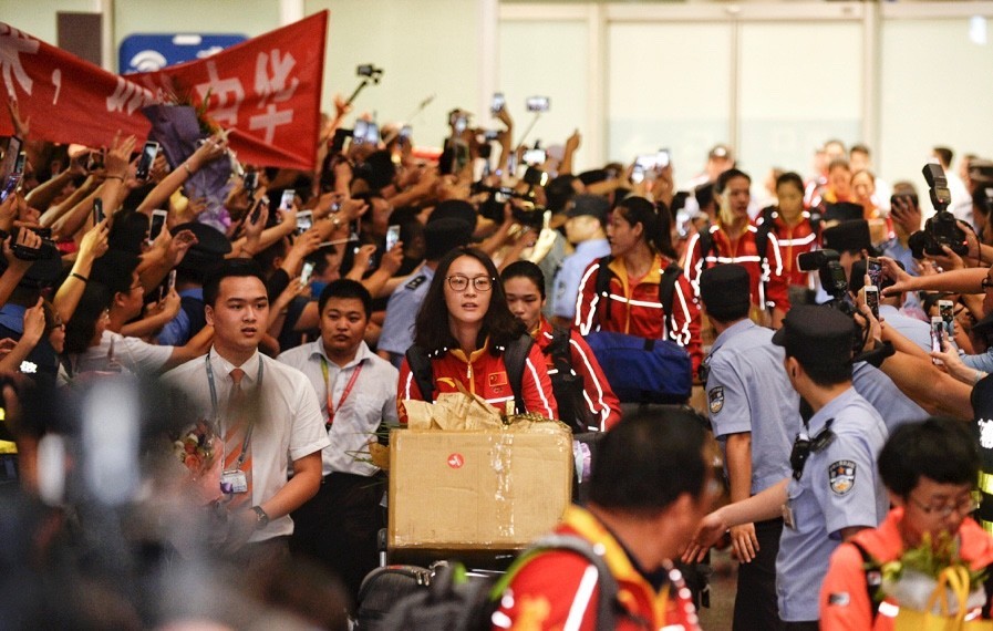 原计划晚上7点40分抵达的航班在延误两小时后抵达首都机场,随着现场一阵欢呼声,张培萌、苏炳添、丁宁等运动员陆续出现。随后,女排姑娘们的出现更是点燃现场球迷的热情。中国女排在里约奥运会上的奋勇拼搏,振奋国人。大家真诚地发出掌声和欢呼,是对她们在赛场上付出的汗水和艰辛的敬佩。
