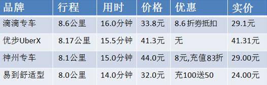 消费者最关心的还是价格。本次实测,易到为32元,滴滴专车为33.8元,神州专车44元,优步为41.31。不过,各大品牌均有折扣,易到24元(充100送50)神州专车实际支付为29元(8元抵用券,充值立享8.3折);滴滴专车紧随其后为29.1元(专车8.6折抵用券4.7元), 优步则没有优惠实付价为41.31元。同样的线路,同样的里程优步最贵,滴滴其次,相比以前大规模发放优惠券,在滴滴收购优步之后,价格果然上调了。