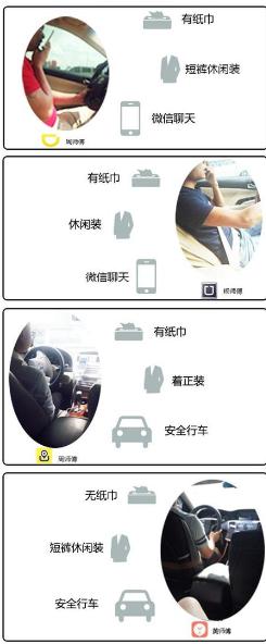 对比发现除了易到以外,其他三家都配有纸巾,着装方面只有神州是正装,其他均为随意休闲装,但是在最为引人关注的行车安全方面,滴滴和优步的专车司机则在行驶过程中使用手机微信聊天,各大网站均发表过文章表示,因为玩手机导致的车祸占车祸总量的2成以上,和酒驾占比相当。而且现在明文规定,开车期间用手机将被处罚200元罚款以及扣2分。在运营期间开车玩手机,极大的影响了乘客的出行安全,这种不负责任的服务态度实在难以让乘客接受。