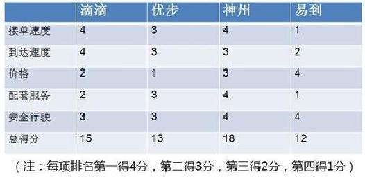 通过对比接单速度,到达速度,价格,配套服务,安全行驶指标进行综合评判,最终神州专车以18分的总分夺得第一,滴滴、优步、易到分列后三位。