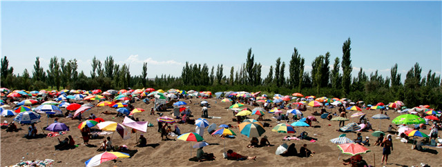 当天,在距离吐鲁番市区8公里的吐鲁番市维吾尔医医院沙疗中心,高低错落的沙丘上各式花伞凉棚像是彩色各异的花朵,来自全国各地前来做沙疗的人们或躺、或靠,不仅将身体埋在滚烫的沙子里,还在不停的喝滚烫的热茶,人们在这里享受沙疗的乐趣,形成了一道独特的风景。