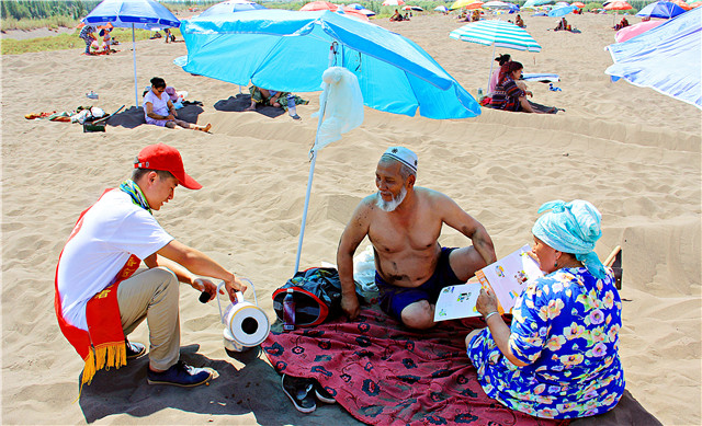来自湖南长沙的游客郭建辉娴熟的用耙子挖了一个U字型的坑,然后身着长衣长裤躺进了沙坑,将自己埋起来,悠闲的看起了报纸。郭建辉说:“我是在网上看到说沙疗挺有效果,尤其是对于有风寒湿这种毛病的。今年我特意安排15天的假期到这来沙疗,我觉得挺好的。明年我打算多带些朋友过来,让他们也感受一下。”