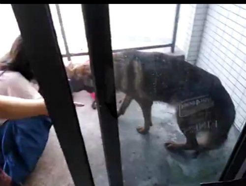 图为志愿者赶到王某平位于东莞的住处,解救出一只奄奄一息的德牧犬