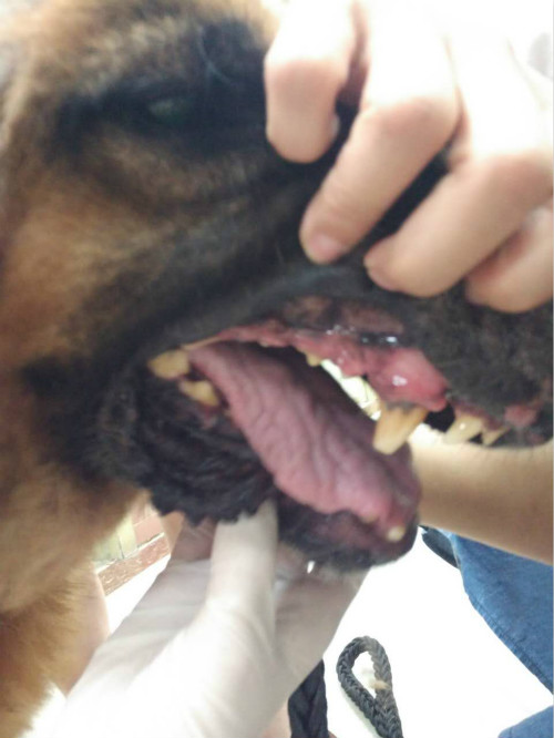 图为志愿者掰开德牧的嘴检查牙齿,牙齿断裂多根,王某平承认是他殴打造成的