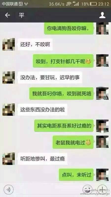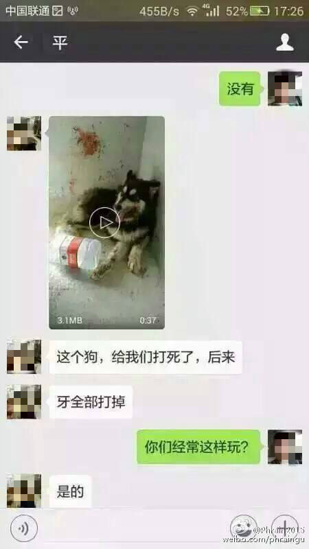 王某平戴着眼镜,长相斯文,平时微信聊天语气谦逊,爱狗志愿者完全没有想到他竟会是个以“虐杀狗”取乐的人。前几天王某平的一组聊天截屏刷爆了网络,图片显示王某平向网友发了多则小视频,其中一则视频里的阿拉斯加狗蜷缩在房间角落,墙壁上全是血,王某平以电击、铁棍殴打等残忍的手段对其进行虐待,十分血腥。网友问其为何要这样做,王某平回答了三个字“好玩嘛”,并且说自己已经虐杀了50多只狗狗。