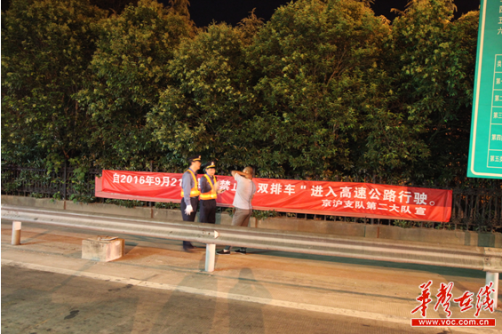 华声在线9月21日讯(通讯员 黄国胜 孙大利 史晓阳) “对不起,师傅,您这是双排车,按照超限超载新政,禁止上高速,请您立即驶离收费站口。”9月20日23时52分,江苏省高速公路交通运输执法总队京沪支队按62号交通部令,在辖区收费站口全面开展了超限超载新政宣贯和执行行动。