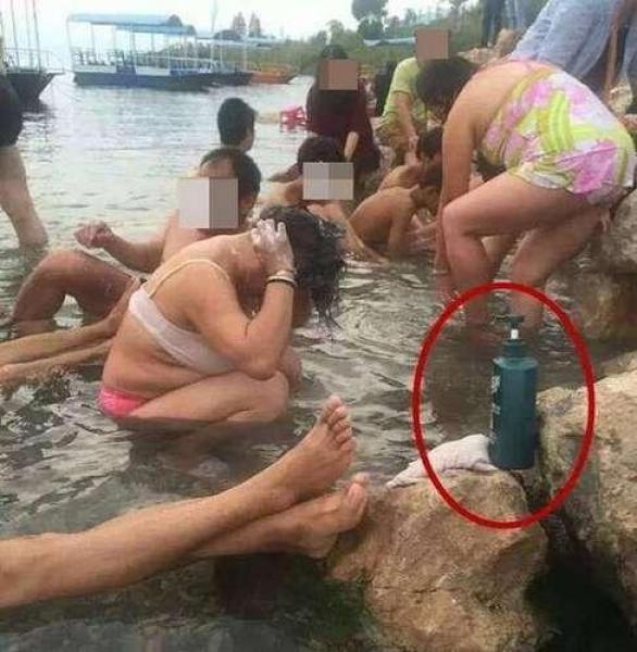 9月12日,云南玉溪抚仙湖内,一群民众带着洗发水在抚仙湖中洗澡一幕被人拍到。从照片上看,这位洗头的大妈穿着内衣,肆无忌惮地用洗发水洗头,周边的人都视而不见,也没有人劝阻,更没有人制止。