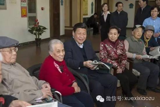 (2013年12月28日据新华社新华视点微博报道,在四季青敬老院,正在开展读书读报活动的老年人见到总书记来了,十分激动,热情邀请总书记听他们诵读《养生歌》。习近平认真听完后,同老人们交流心得。他说,活到老,学到老。保持健康心态和身体,就要靠这样积极进取的精神。从你们的读书活动中我得到很多启示。)