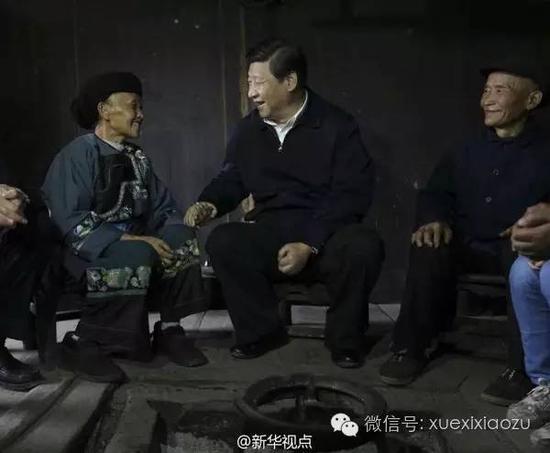 (2013年11月3日,习近平在湘西土家族苗族自治州考察,来到花垣县十八洞村特困户施齐文家。习近平握住老人的手询问年纪,听说老人64岁了,他说:“你是大姐。”)