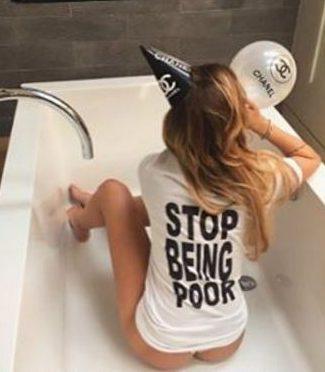 当然,这些爱炫耀的青年除了想法子挥霍,也用尽各种“创意”手段嘲笑他们眼中的“穷人”。一个黄发姑娘就在浴缸里戴着一顶香奈儿的派对帽子,露出T恤背后“别再穷下去了”的字样。