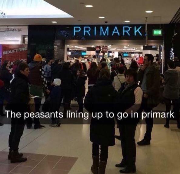 另一位富二代则对排队等候进入Primark(英国服装零售公司,价格实惠中端)的市民们加以嘲笑,称这些人为“农民”。