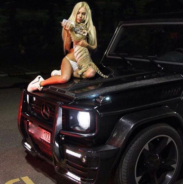 图为一位女孩在她的私家车上给宠物喂食:不同寻常的是,她的宠物是一只小老虎。
