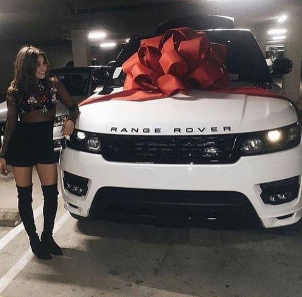 图为女孩展示她的生日礼物:一辆昂贵的路虎。