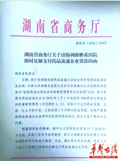 12月初,一份由省商务厅发给省医改办的函件在网络上引发关注。作为省内药品流通行业主管部门及湖南省公立医院改革工作领导小组联席成员单位,省商务厅要求,责成长沙20家大型公立医院尽快向药品配送企业兑现药款。