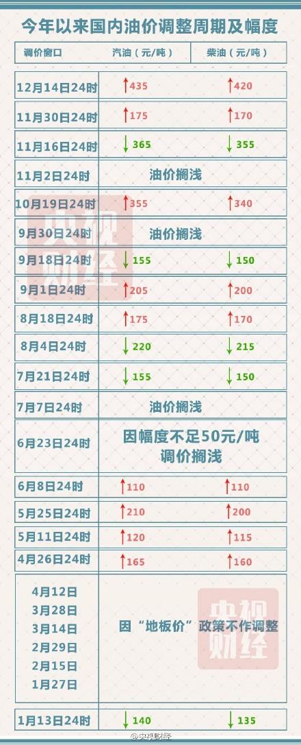 【15日0点涨油价!加满一箱汽油将多花17元】 15日0时,国内油价迎年内第9次上调:汽油每吨上调435元,柴油每吨上调420元。折合每升90号汽油每升上调0.32元,92号汽油每升上调0.34元,95号每升上调0.36元,0号柴油每升上调0.36元。一般家用汽车油箱50L,加满一箱92号汽油将多花17元。