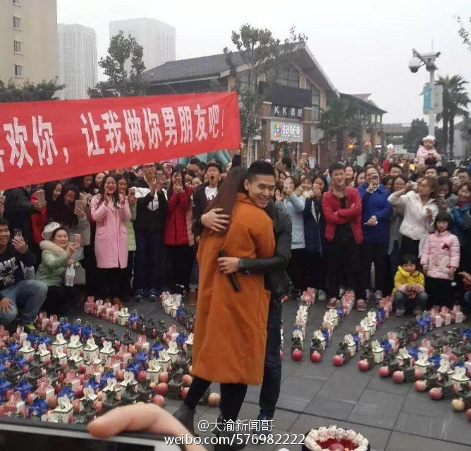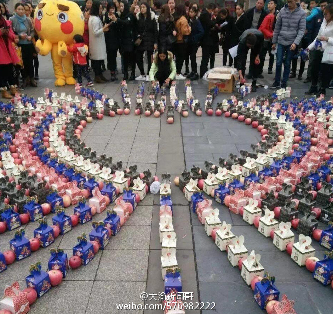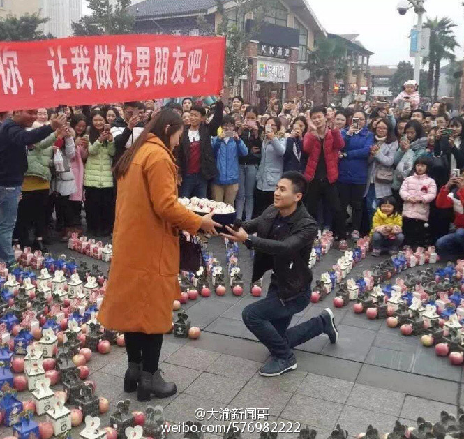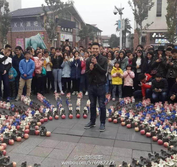 据网友爆料,重庆大学城熙街,满地苹果,很强势嘛,表白成功,群众抢苹果!现在表白不送花,送水果了?水果现在当真也是表白神器了啊!