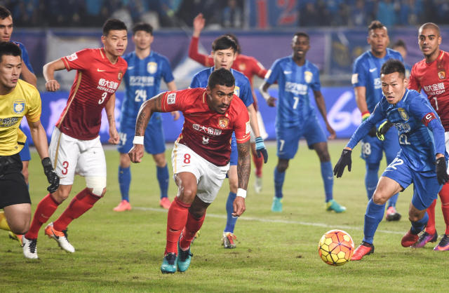 ↑2016年11月27日,江苏苏宁队球员吴曦(前右)与广州恒大淘宝队球员保利尼奥(前中)在比赛中争抢。新华社记者杨磊摄
