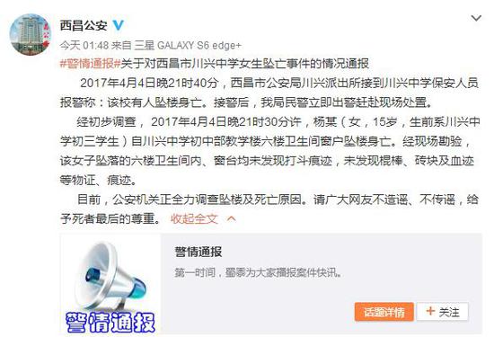 据警方通报,2017年4月4日晚21时40分,西昌市公安局川兴派出所接到川兴中学保安人员报警称:该校有人坠楼身亡。接警后,民警立即出警赶赴现场处置。