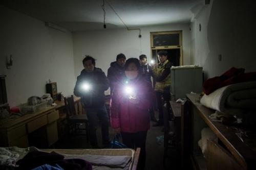 2015年12月18日,山东济南,白天要上班,王志宝夫妇在晚上跟着中介看二手房。这间临街的顶楼房没有灯,他们只好拿手机照明。