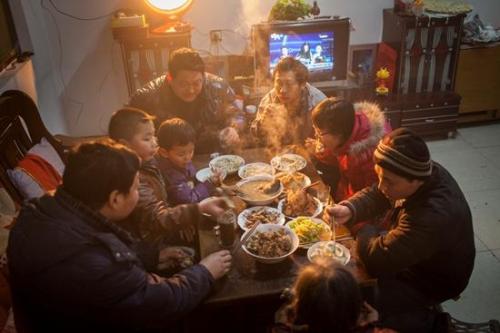 2013年2月9日,山东肥城老家。大年三十的晚上,王志宝和亲友在一起吃年夜饭,妻子在一旁照看哭闹的孩子。