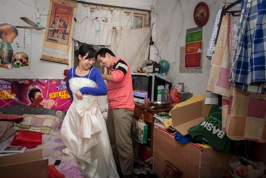 2011年9月16日,出租房内,王志宝帮妻子试穿租来的婚纱。