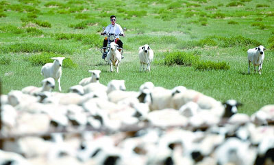 年轻牧民阿特兰特骑着摩托车赶羊。和阿特兰特一样,内蒙古很多生活在草原深处的牧民过上了现代生活。新华社发
