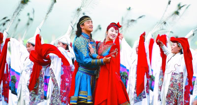 8月8日,内蒙古自治区成立70周年庆祝大会上,群众在表演节目。新华社发