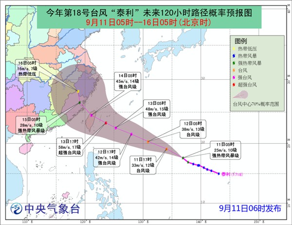 预计,“泰利”将以每小时25-30公里的速度向西偏北方向移动,强度继续增强,最强可达强台风级或超强台风级(15-17级,48-60米/秒),并将于13日夜间在台湾东部沿海登陆(强台风级或超强台风级,15-16级,48-55米/秒),穿过台湾后逐渐趋向福建沿海。