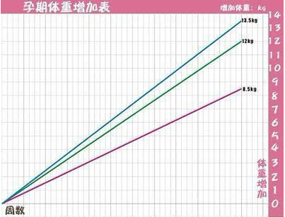 参考图中绿色曲线,在最底下的横排中找出自己怀孕周数,再对应竖排的体重增加数,由于孕前BMI在18.5~23.9之间的属于标准体重,所以整个孕期,体重增加12kg左右是正常的