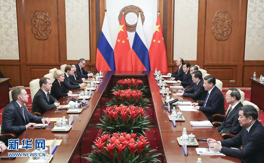 习近平欢迎梅德韦杰夫在中共十九大胜利闭幕后随即访华,强调俄罗斯是中国的最大邻国和全面战略协作伙伴,中方发展和深化中俄关系的明确目标和坚定决心不会改变。中方愿同俄方一道,扩大各领域、全方位合作,密切在国际事务中的协调和配合,推动构建人类命运共同体。相信中俄全面战略协作伙伴关系会在新起点上把握新机遇,展现新气象,取得新成果。