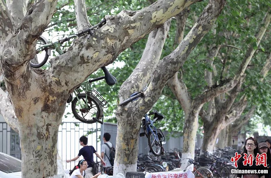 毕业季,不少毕业生不愿将自己的自行车带走,就近挂在树上。